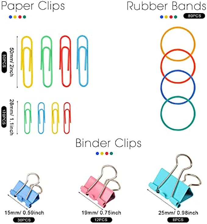 • Efficient File Arrangement: various sizes, different binder clips, paper clips, and rubber bands, multi-colors, suitable for different thickness, type, scene of information annotation and file arrangement, let you more relaxed and interested in the process of work.