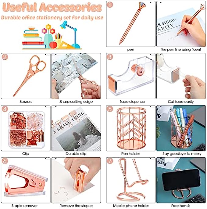 • Packing Listing: you will get a set of desk accessories, which includes 1 stapler, 1 tape holder, 1 staple remover, 1 pen holder, 1 box of staples, 1 mobile phone holder, 2 diamond pens, 1 ruler, 1 scissors and 1 box of binder clips; This set can meet your needs in daily life and work